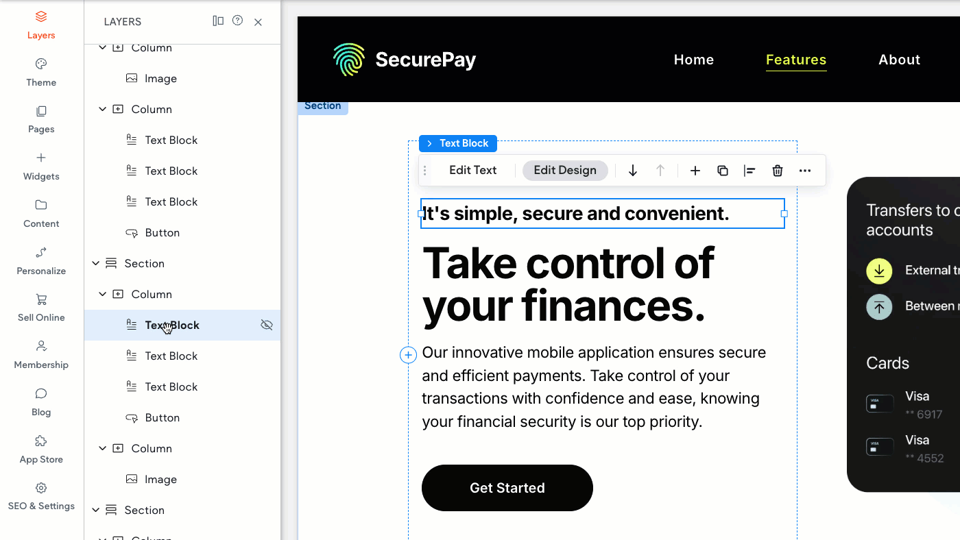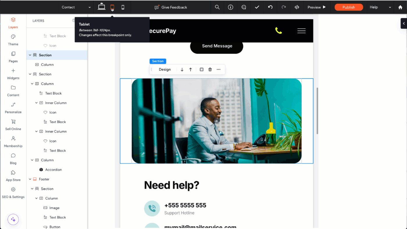 To control which sections or elements appear on your mobile and tablet layouts, you can manage their visibility directly from the Layers Panel.