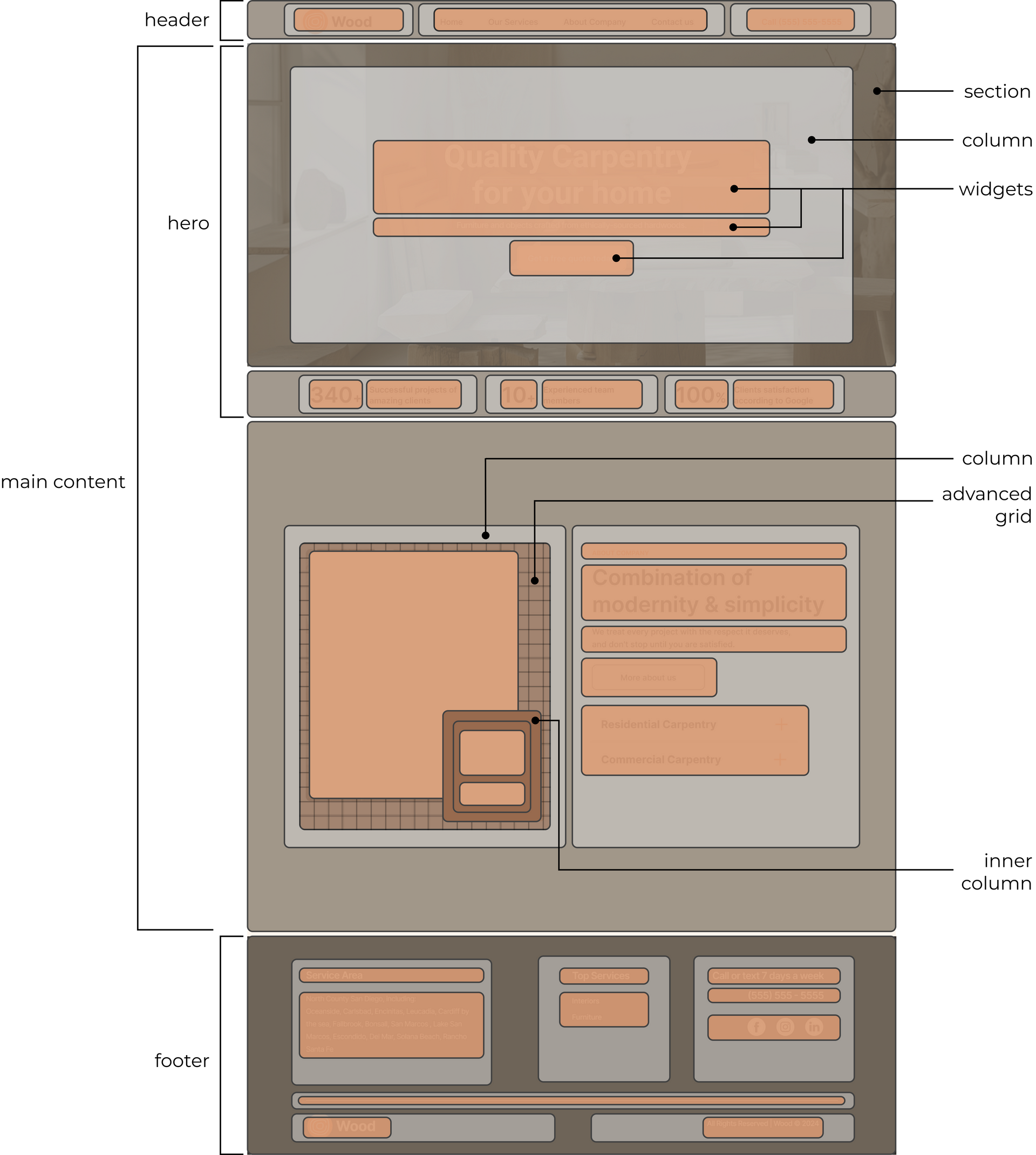 Think of sections as broad containers that divide your page into major areas. They help structure and organize content, similar to how