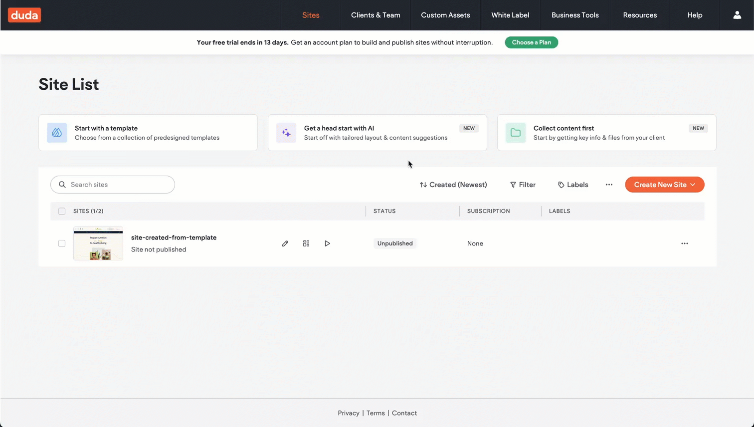 If you want to collect content from your client before creating a site, from your Site List, click Collect content first. From there, you can share a link to the content collection form.