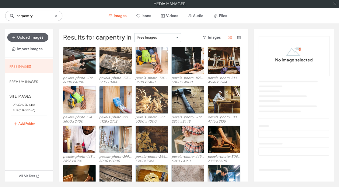 In those moments when you need an image but your client doesn't have one, know that Duda provides access to a library of free images (source from Pexel) and premium images (sourced from Shutterstock) within the editor. These can be added directly to your site’s media library and used across various widgets.