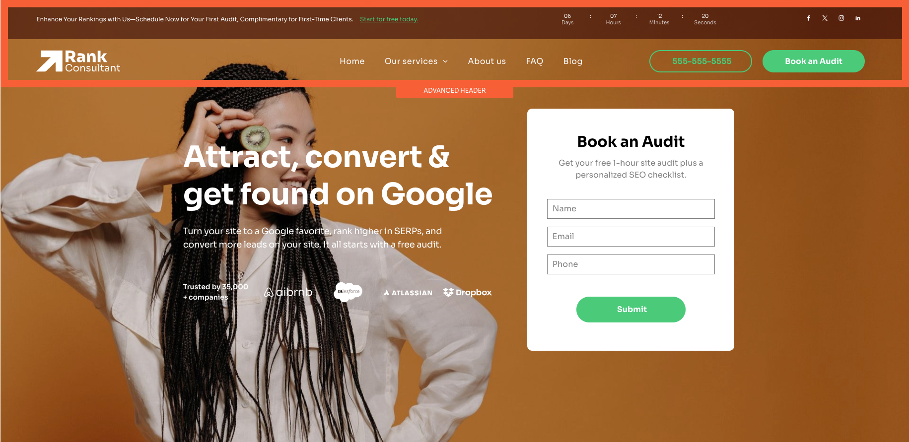 If you need more control over your header’s design, advanced headers provide further customization beyond the basic header. This option allows you to incorporate complex elements such as social icons, additional navigation links, or custom HTML blocks.