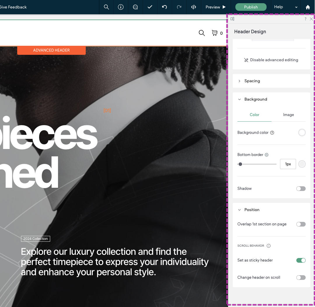 Advanced Header to drill deeper — with additional buttons, social icons, sticky headers, advanced scrolling behaviors, and more!