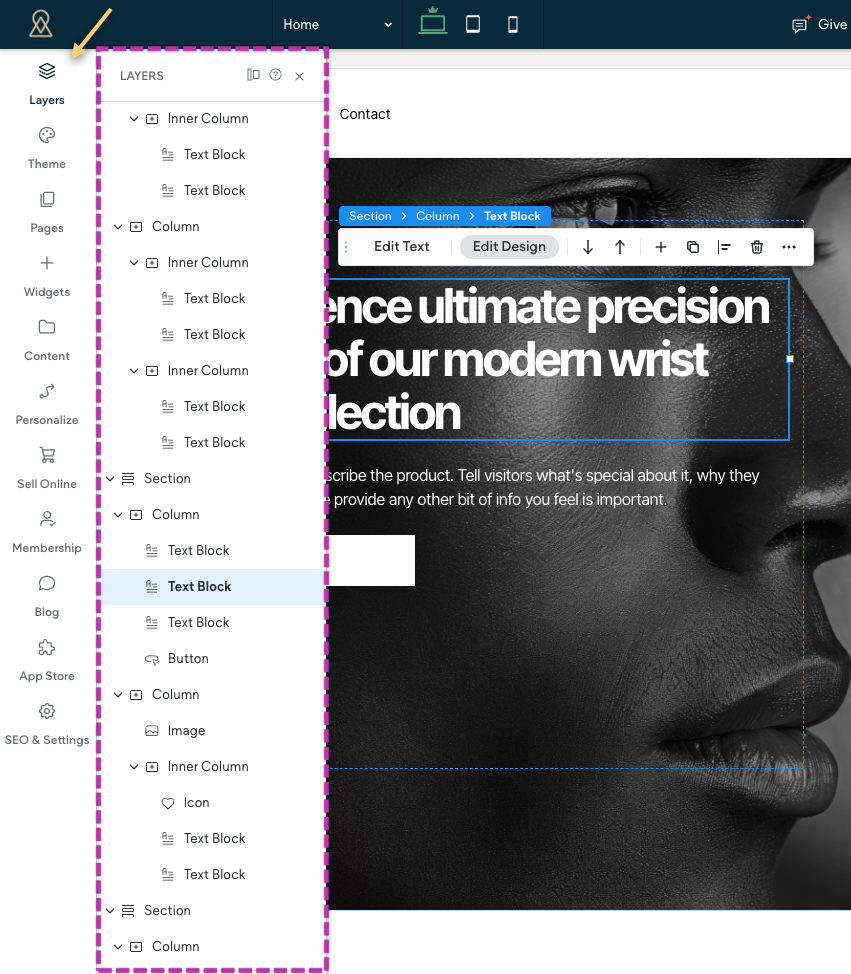Layers panel, offering a quick way to see how the site is built and navigate between elements. Every element on a page is listed and shown within the structural hierarchy of that page.