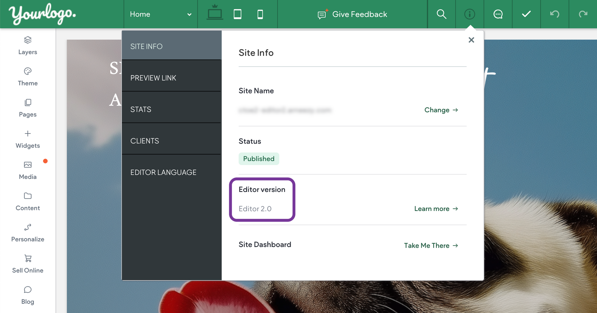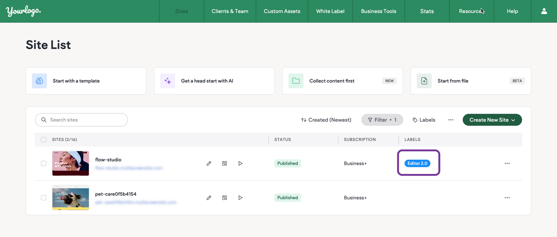 In your Site List, Editor 2.0 sites are labeled Editor 2.0